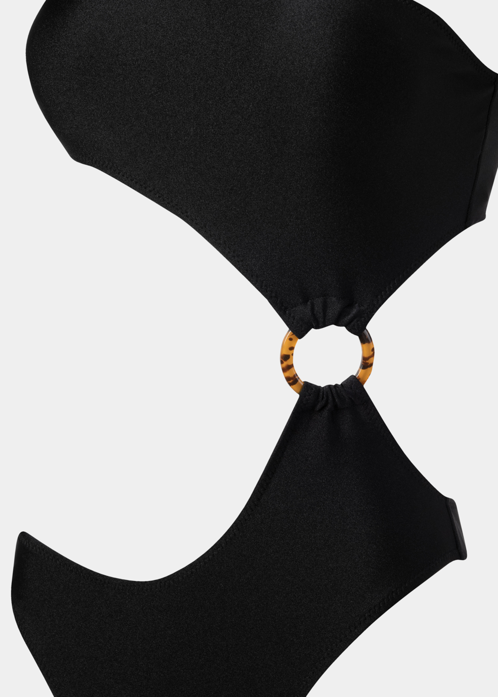 Ένα εντυπωσιακό ολόσωμο μαγιό με one-shoulder σχεδιασμό που αγκαλιάζει και αναδεικνύει τη σιλουέτα με μοντέρνα, ασύμμετρη γραμμή. Διαθέτει έντονο cut-out στο πλάι, ενωμένο με λεπτομέρεια κρίκου σε tortoiseshell, προσφέροντας έναν συνδυασμό κομψότητας και δυναμικού χαρακτήρα. Το λείο, ελαστικό ύφασμα εφαρμόζει τέλεια στο σώμα, χαρίζοντας ένα εκλεπτυσμένο και confident καλοκαιρινό look.