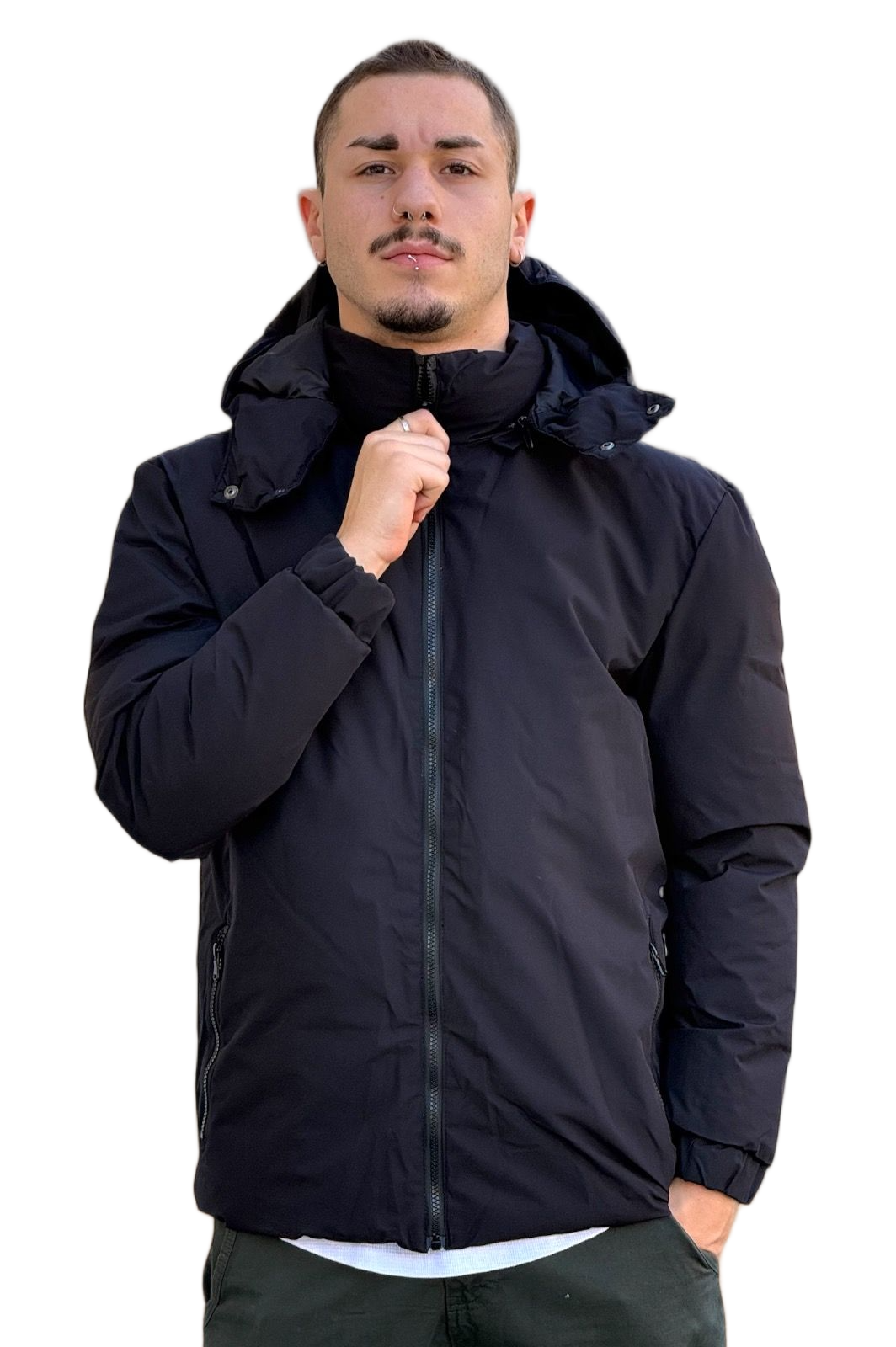 Ανδρικό μπουφάν σε μαύρη απόχρωση με κουκούλα και μοντέρνα εφαρμογή. Διαθέτει φερμουάρ μπροστά, πλαϊνές τσέπες με κλείσιμο και λάστιχο στα μανίκια για καλύτερη εφαρμογή και προστασία από το κρύο. Ιδανικό για καθημερινές εμφανίσεις, προσφέρει άνεση και στυλ σε κάθε περίσταση.