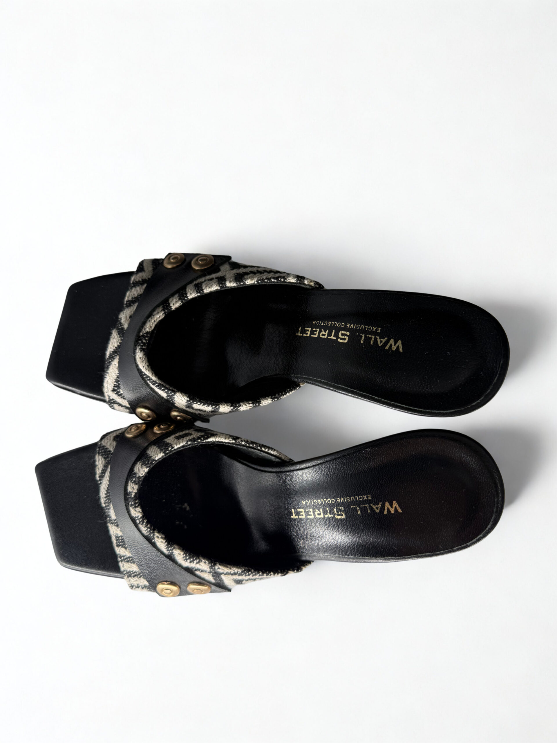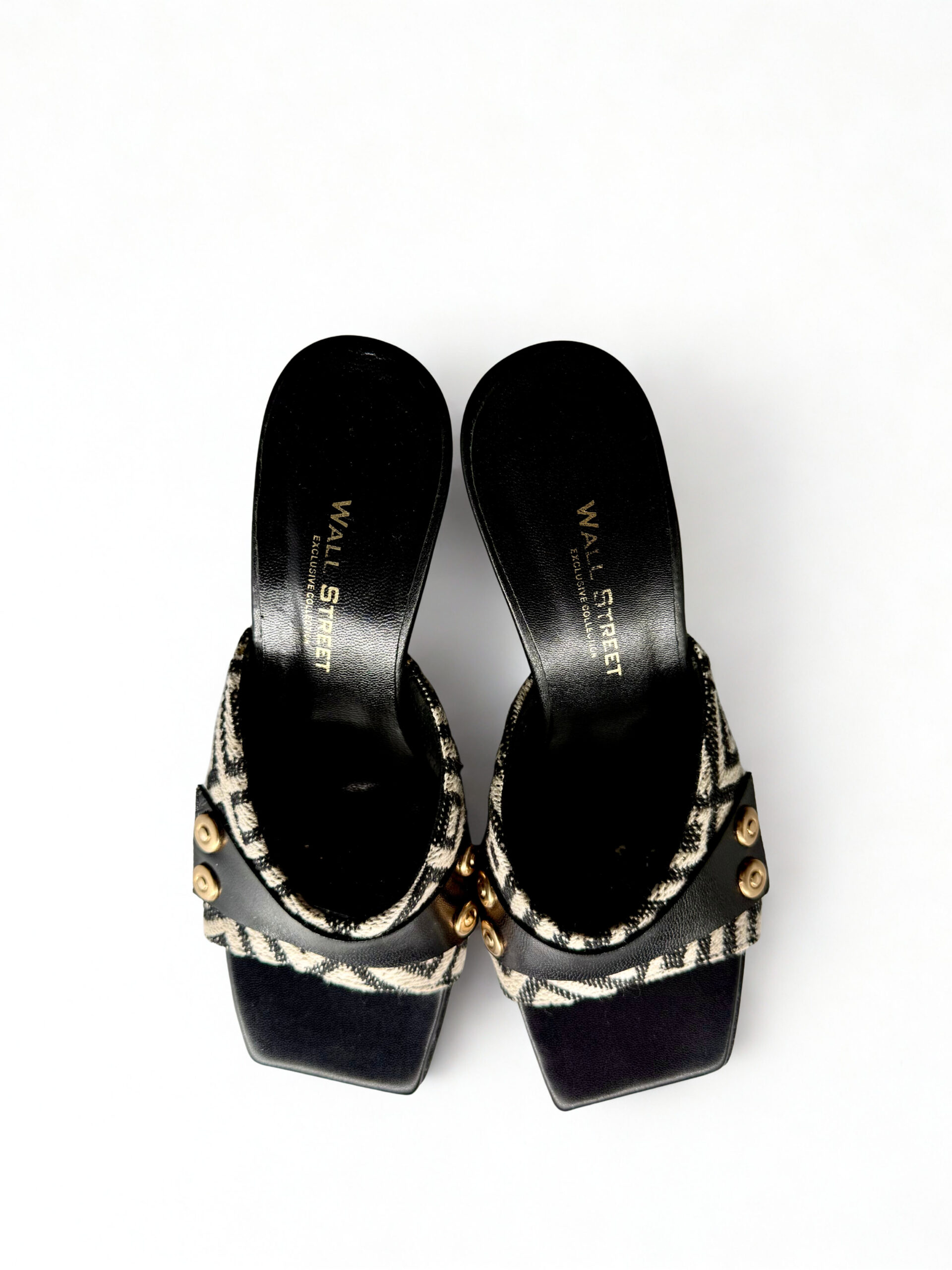 Γυναικεία mules με τακούνι σε μαύρο χρώμα και υφασμάτινες λεπτομέρειες σε ασπρόμαυρο μοτίβο. Το σχέδιο διαθέτει τετράγωνη μύτη που χαρίζει μοντέρνα γραμμή, ενώ οι χρυσές μεταλλικές αγκράφες στο πλάι προσθέτουν κομψότητα και προσεγμένη αισθητική. Το σταθερό τακούνι προσφέρει άνεση στο περπάτημα, ενώ η εσωτερική επένδυση εξασφαλίζει ευχάριστη εφαρμογή. Πρόκειται για σχέδιο που συνδυάζει διαχρονικό μαύρο με γεωμετρικές λεπτομέρειες, δημιουργώντας ένα κομμάτι με ιδιαίτερο χαρακτήρα.