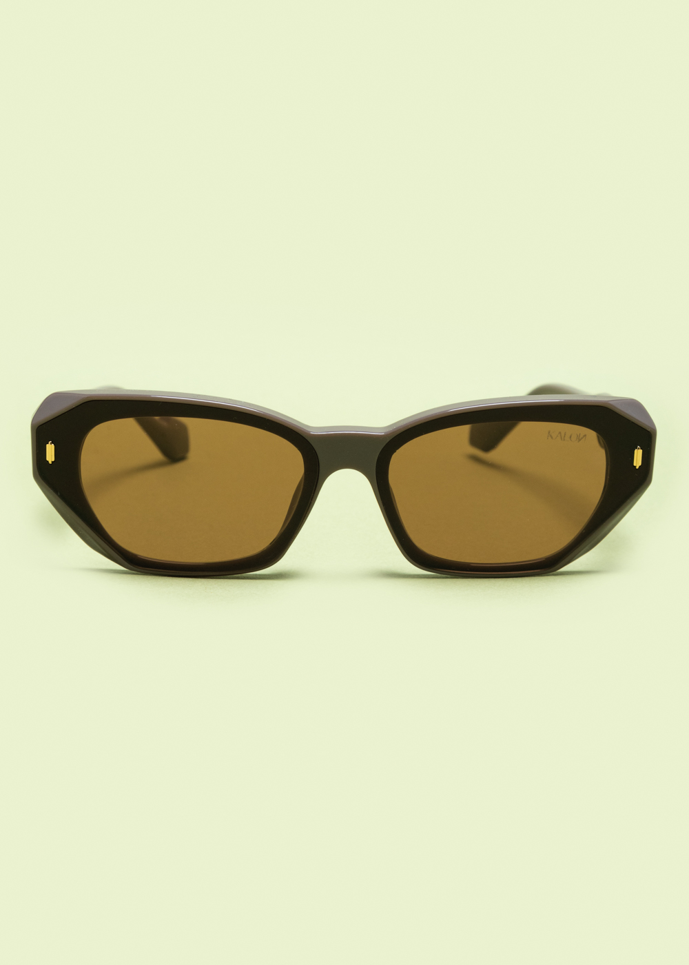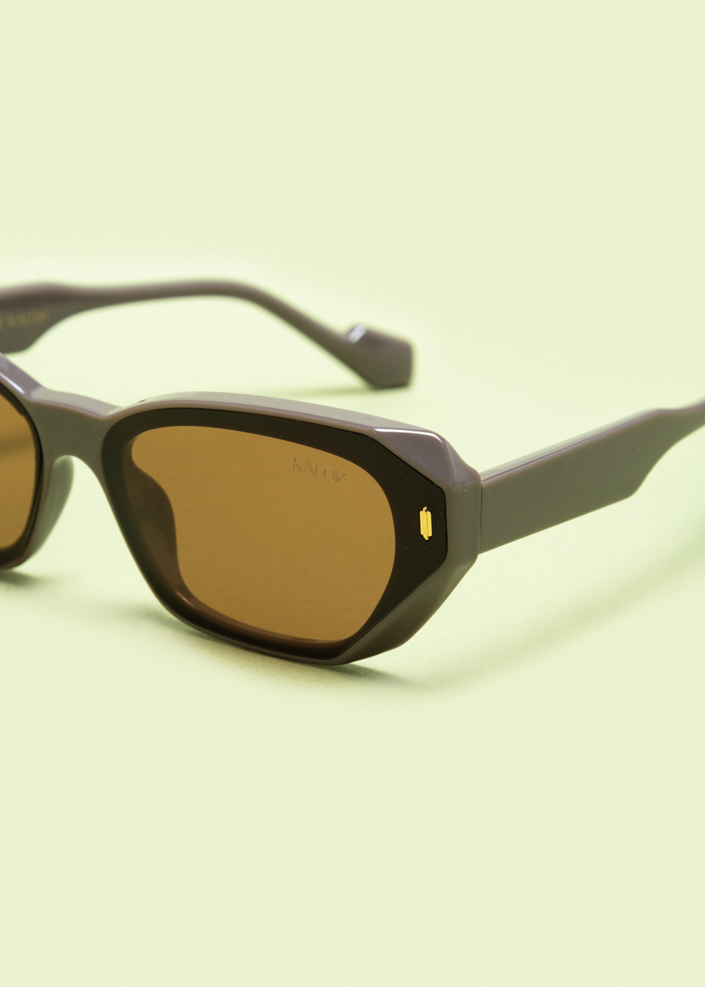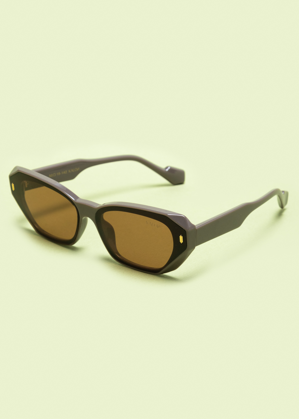Γυαλιά ηλίου με ιδιαίτερο γεωμετρικό σκελετό σε γκρι χρώμα. Διαθέτουν καφέ φακούς και διακριτικές χρυσές λεπτομέρειες στους βραχίονες. Ένα μοντέρνο και κομψό σχέδιο που προσθέτει χαρακτήρα σε κάθε εμφάνιση.