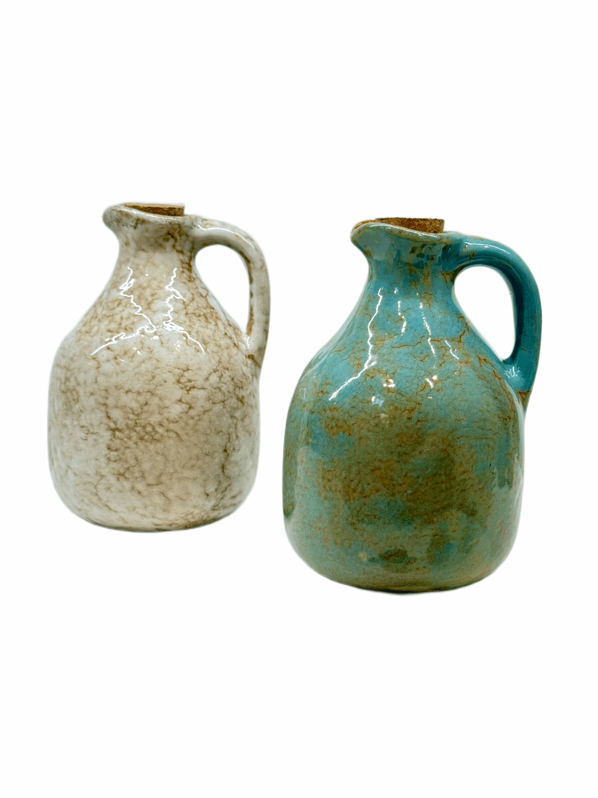 Χειροποίητο κεραμικό δοχείο σε μπεζ αποχρώσεις με γυαλιστερό φινίρισμα και φελλό. Μπορεί να χρησιμοποιηθεί ως βάζο, διακοσμητικό ή για την αποθήκευση μικρών ποσοτήτων λαδιού/ποτού.