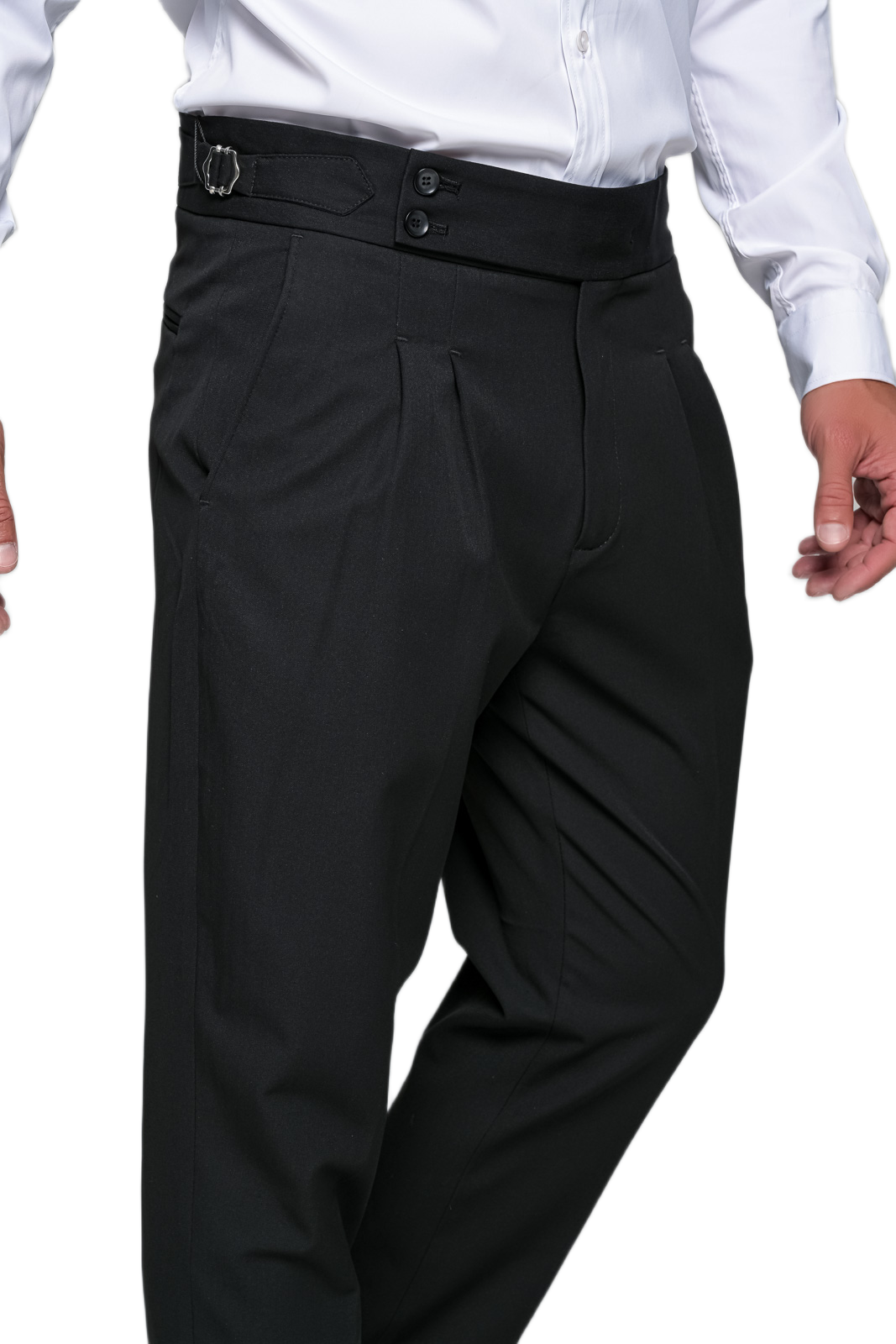 Κλασικό ανδρικό παντελόνι σε μαύρη απόχρωση, με μοντέρνο κόψιμο και άνετη εφαρμογή. Διαθέτει ψηλή μέση με κομψή διπλή κουμπωτή ζώνη και πιέτες μπροστά που αναδεικνύουν τη γραμμή του. Το διαχρονικό του στυλ το καθιστά ιδανικό για επαγγελματικές εμφανίσεις, αλλά και για πιο formal ή smart-casual συνδυασμούς. Συνδυάζεται εύκολα με πουκάμισο ή T-shirt για ολοκληρωμένο look.