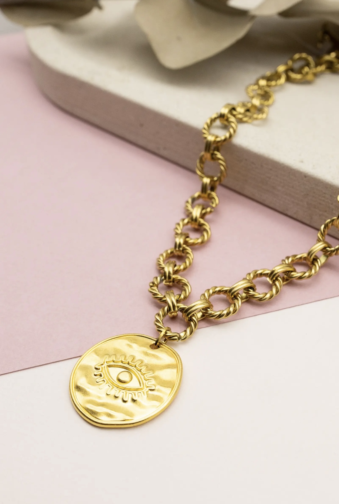 κολιέ με chunky αλυσίδα από στριφτούς κρίκους και στρογγυλό μενταγιόν με χαραγμένο μάτι. Minimal αλλά εντυπωσιακό, προσθέτει μοντέρνα και κομψή πινελιά σε κάθε εμφάνιση. Ιδανικό για να φορεθεί μόνο του ή σε layering.