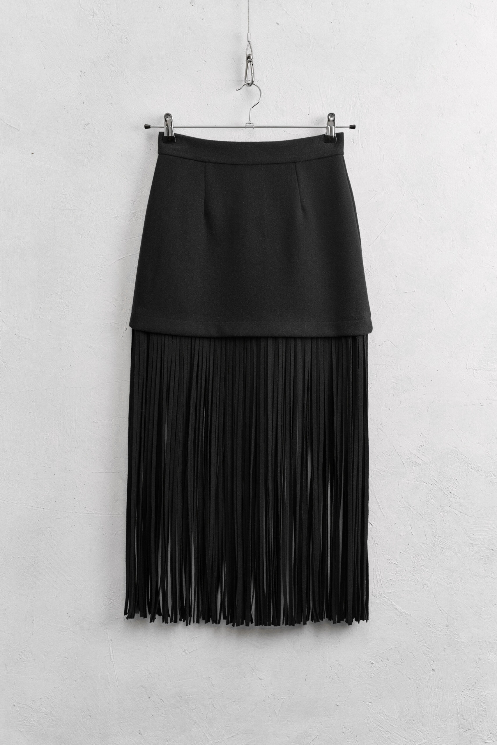 Μίνι φούστα σε μαύρη απόχρωση με εντυπωσιακά κρόσσια που προσθέτουν κίνηση και στυλ.