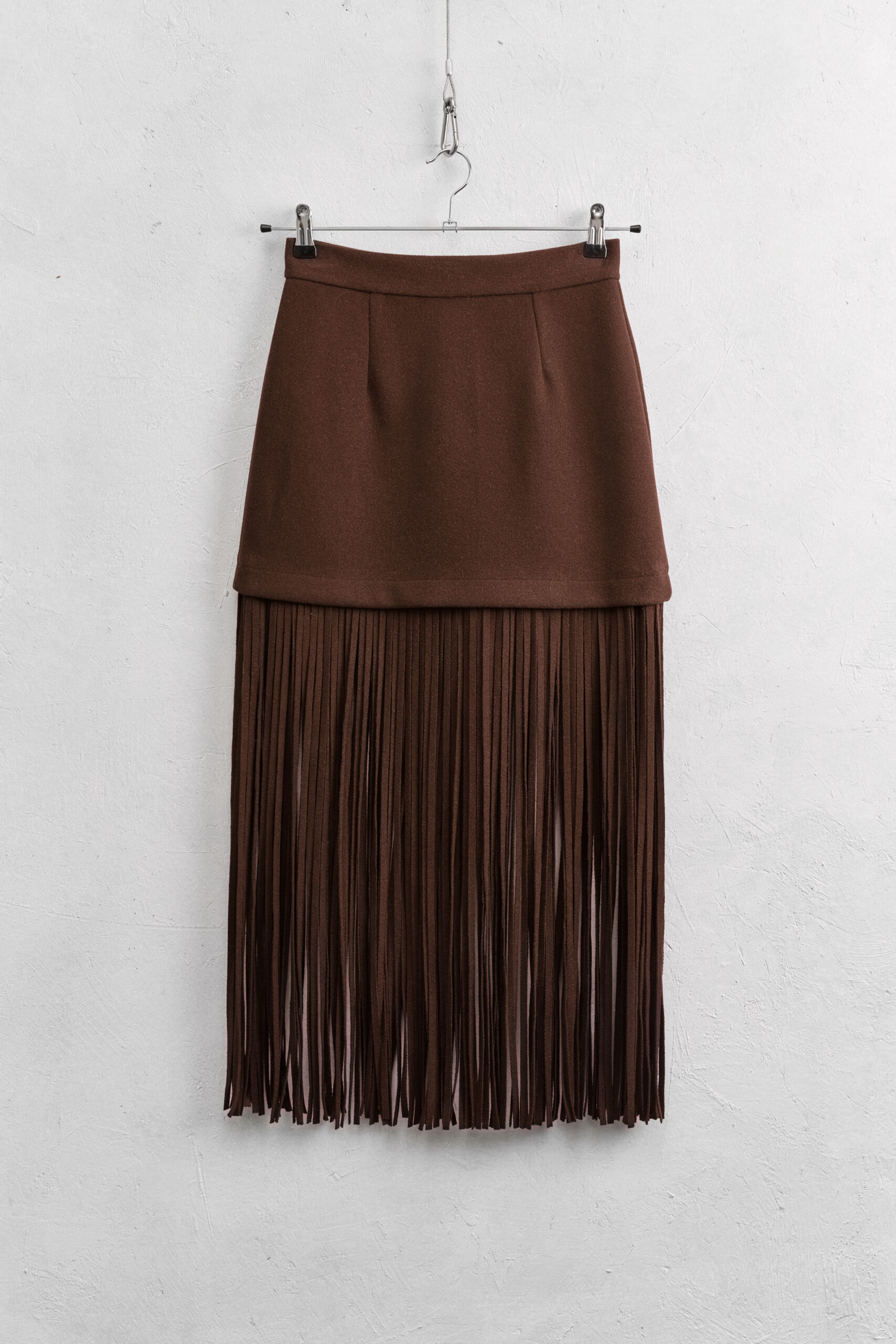 Μίνι φούστα σε καφέ απόχρωση με εντυπωσιακά κρόσσια που προσθέτουν κίνηση και στυλ.