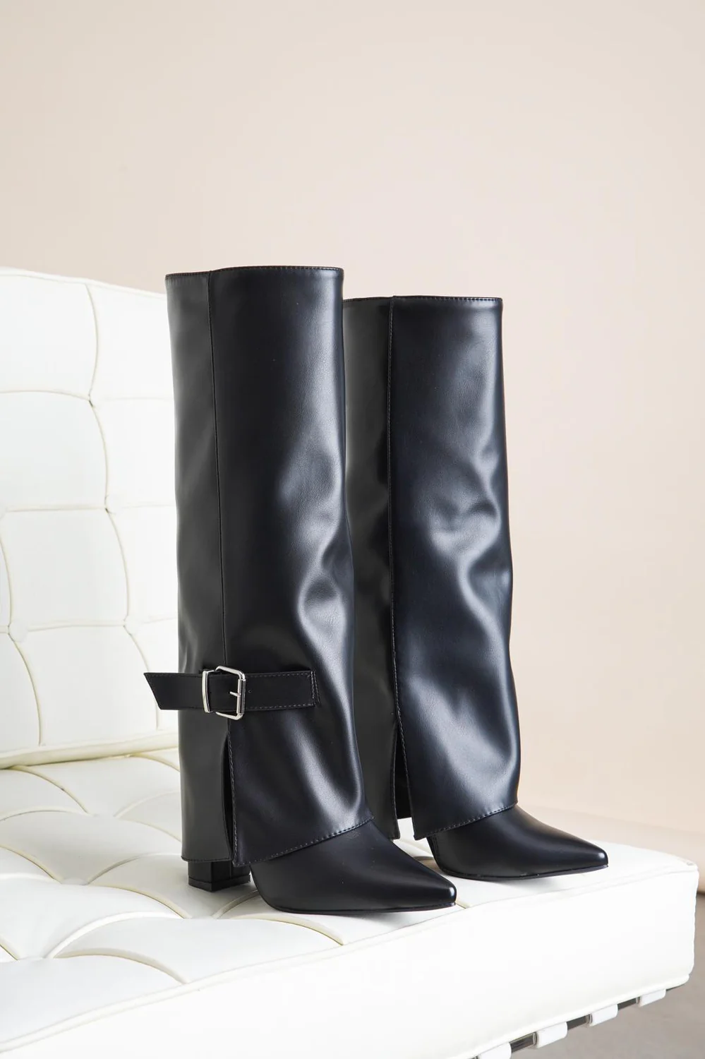 Ψηλές μαύρες μπότες με τετράγωνο τακούνι και αγκράφα στο πλάι.