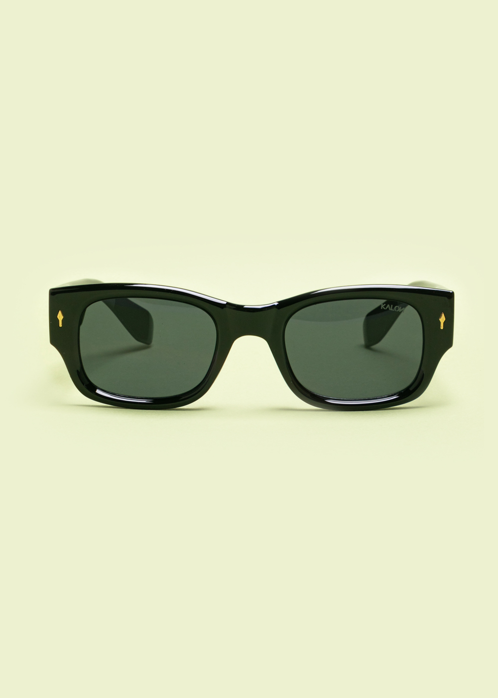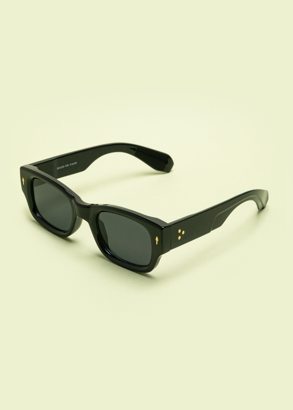Γυαλιά ηλίου με στενό, ορθογώνιο σκελετό σε μαύρο χρώμα. Διαθέτουν σκούρους φακούς και διακριτικές χρυσές λεπτομέρειες στους βραχίονες.