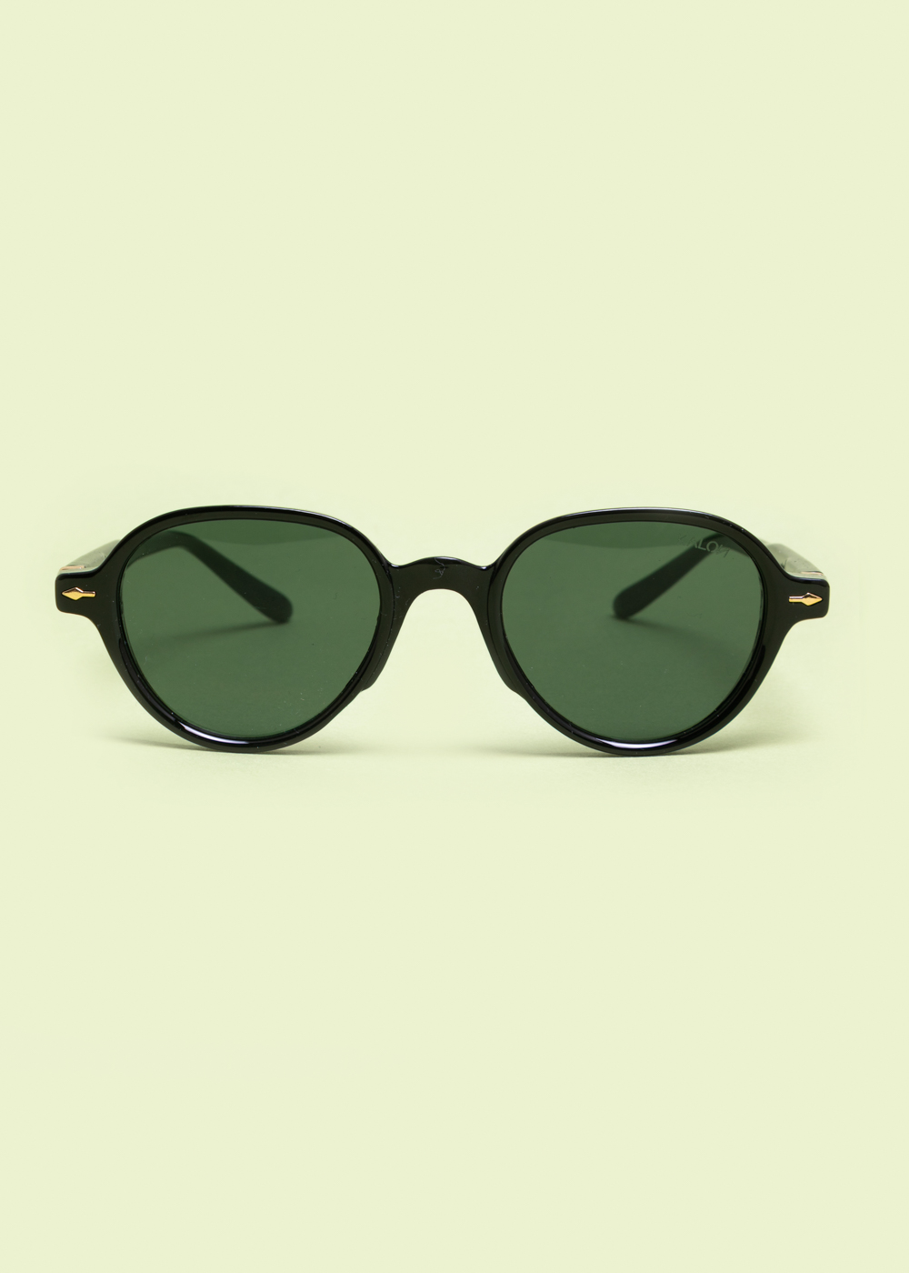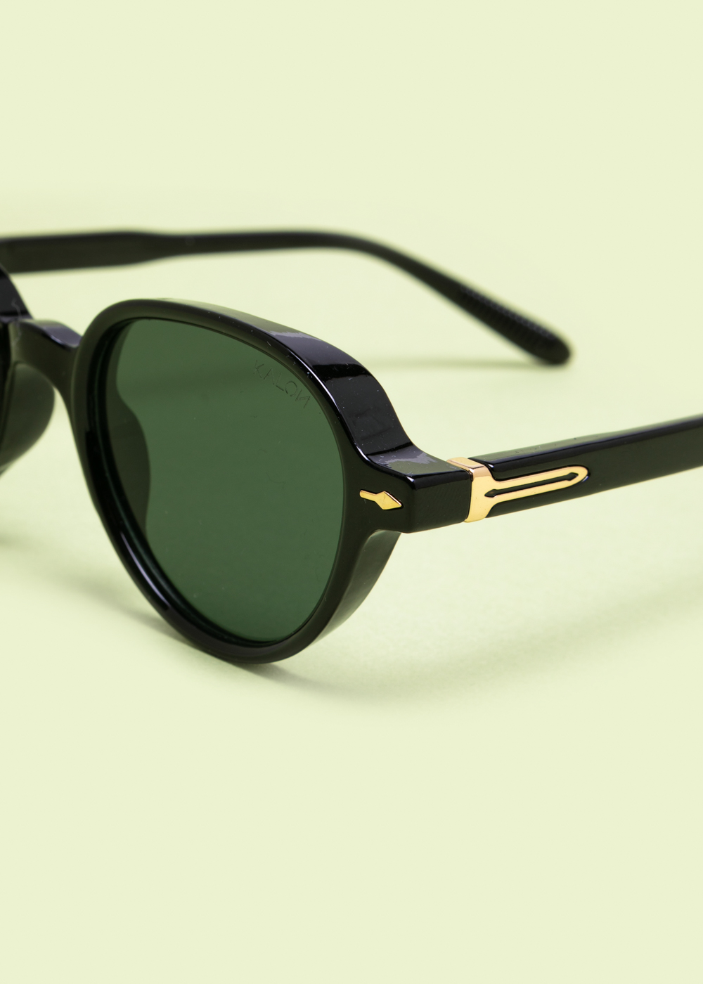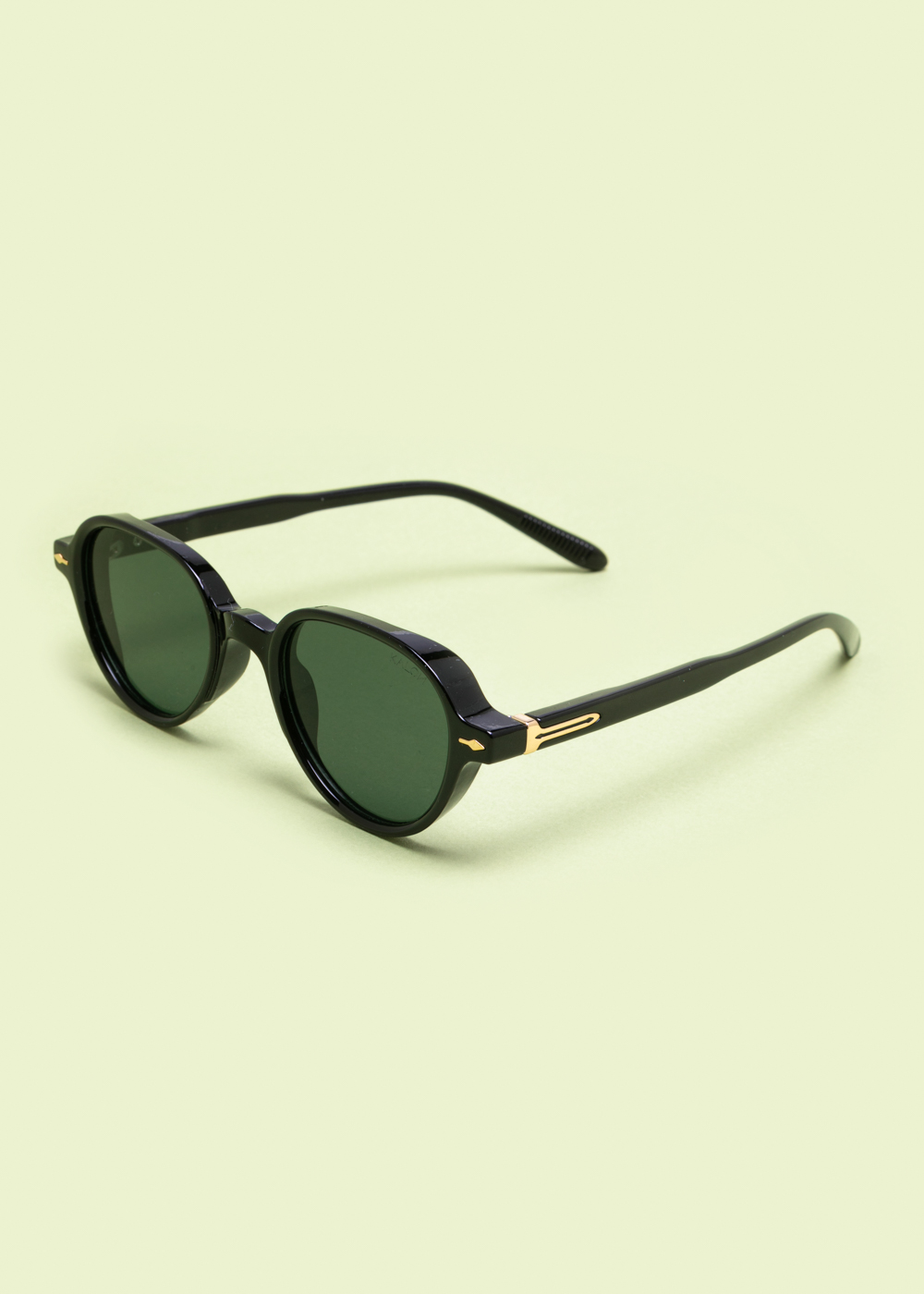 Μαύρα γυαλιά ηλίου με στρογγυλό σκελετό και φακούς σε απόχρωση σκούρου πράσινου. Διαθέτουν χρυσές λεπτομέρειες στα πλαϊνά και σταθερή κατασκευή. Ιδανικά για καθημερινή χρήση και προστασία από τον ήλιο.
