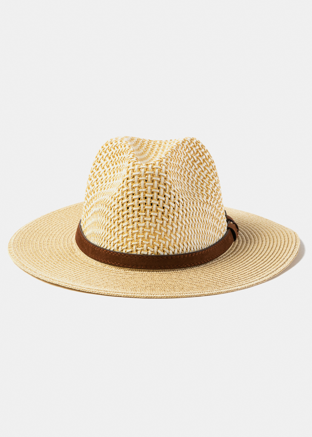 Ένα κομψό fedora hat με ιδιαίτερη woven υφή που συνδυάζει εκρού και φυσικές αποχρώσεις, δημιουργώντας ένα μοναδικό διχρωμικό pattern. Η καφέ δερμάτινη λεπτομέρεια με μεταλλικό στοιχείο προσθέτει χαρακτήρα και elevated αισθητική.