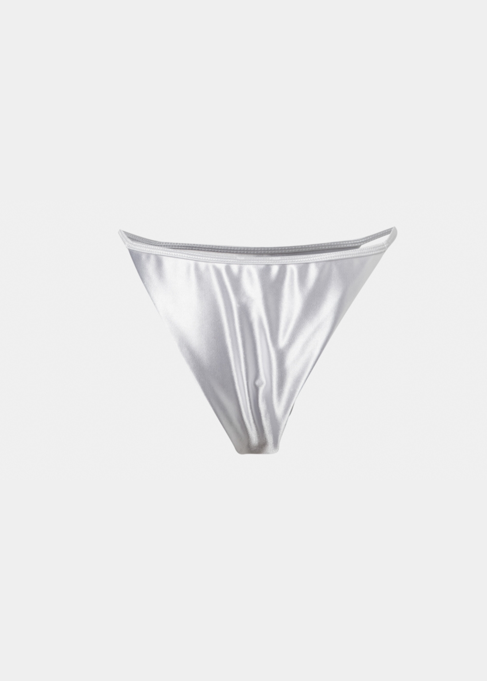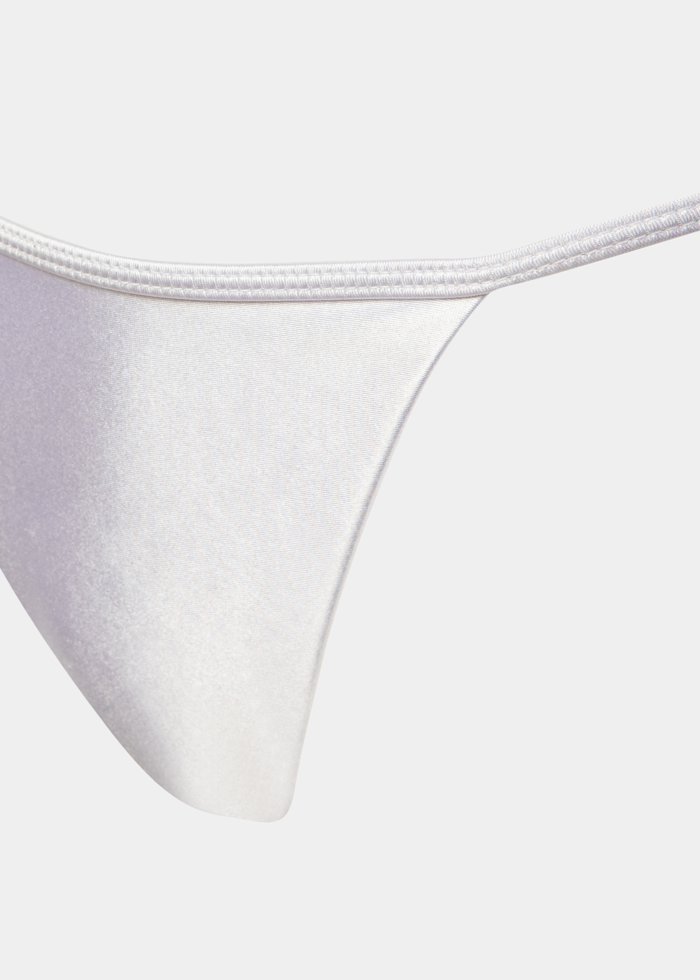 Bikini bottom σε λευκή, λαμπερή απόχρωση που χαρίζει καθαρό και φωτεινό καλοκαιρινό look. Το shimmering ύφασμα αντανακλά το φως και αναδεικνύει το μαύρισμα, ενώ η minimal γραμμή προσφέρει άνετη και κολακευτική εφαρμογή. Ένα διαχρονικό κομμάτι για κομψές εμφανίσεις στην παραλία.