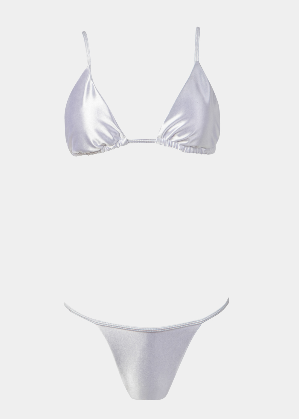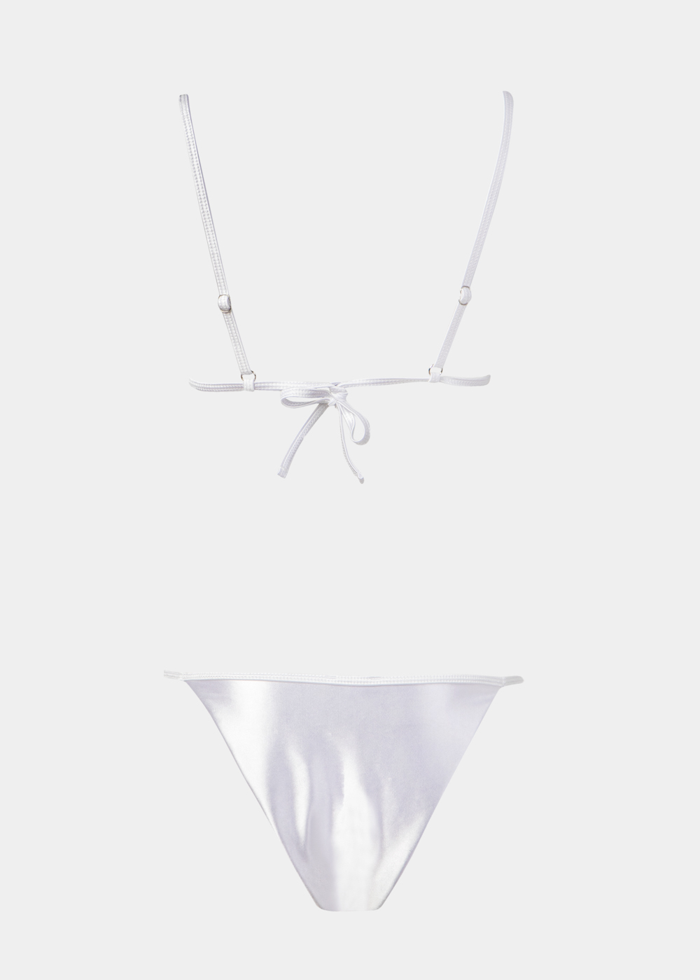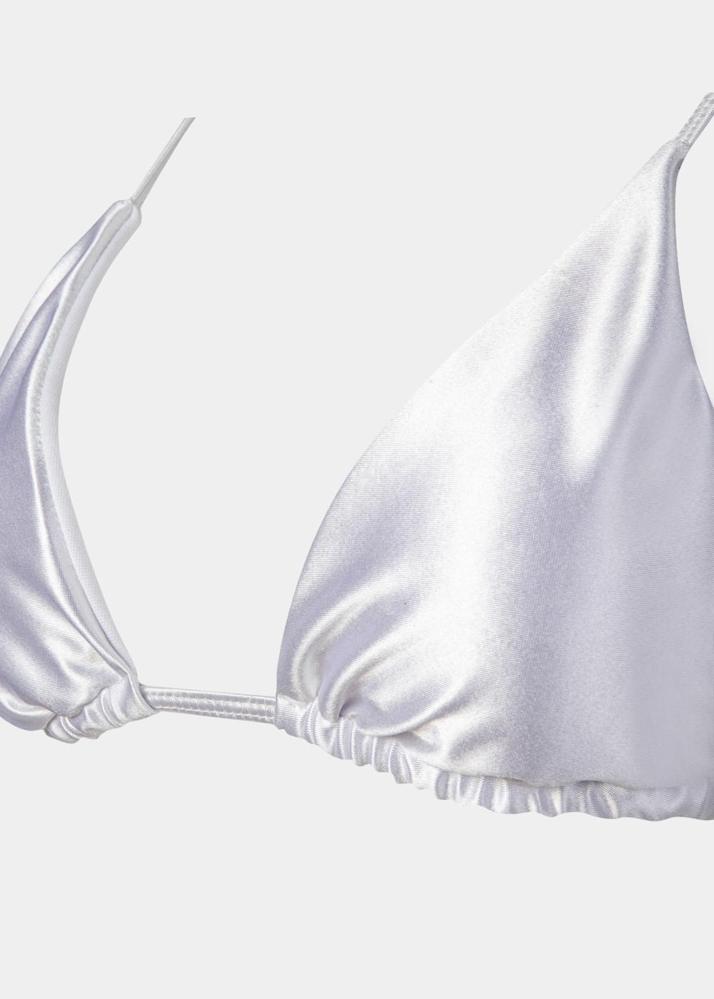 Bikini top σε λευκή, λαμπερή απόχρωση για ένα φρέσκο και φωτεινό καλοκαιρινό look. Το shimmering ύφασμα αντανακλά το φως και αναδεικνύει το μαύρισμα, ενώ οι ρυθμιζόμενες τιράντες και το δέσιμο στην πλάτη προσφέρουν ιδανική εφαρμογή. Minimal και κομψό για κάθε περίσταση.