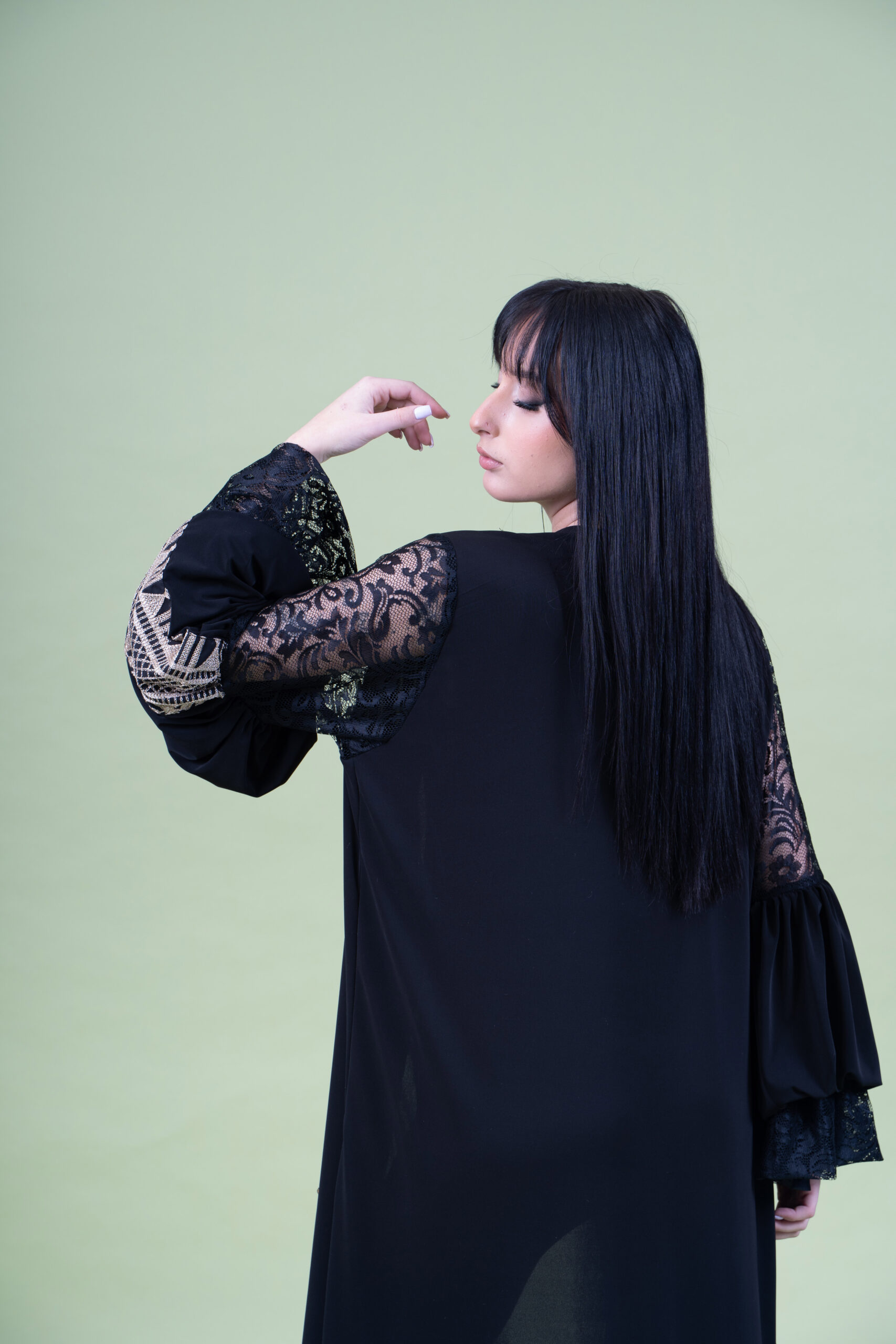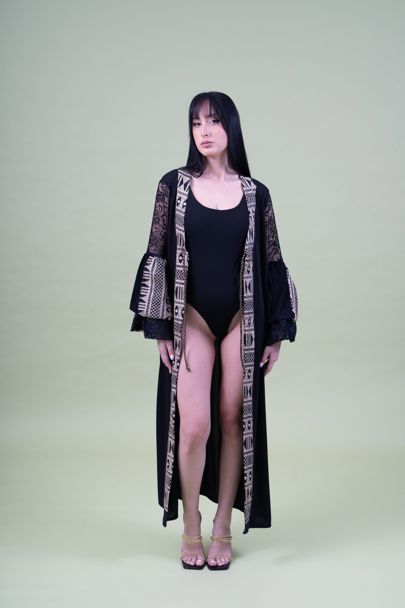 Ανάλαφρο, αέρινο κιμονό σε βαθύ μαύρο, με διακριτικά tribal κεντήματα και δαντελένιες λεπτομέρειες.