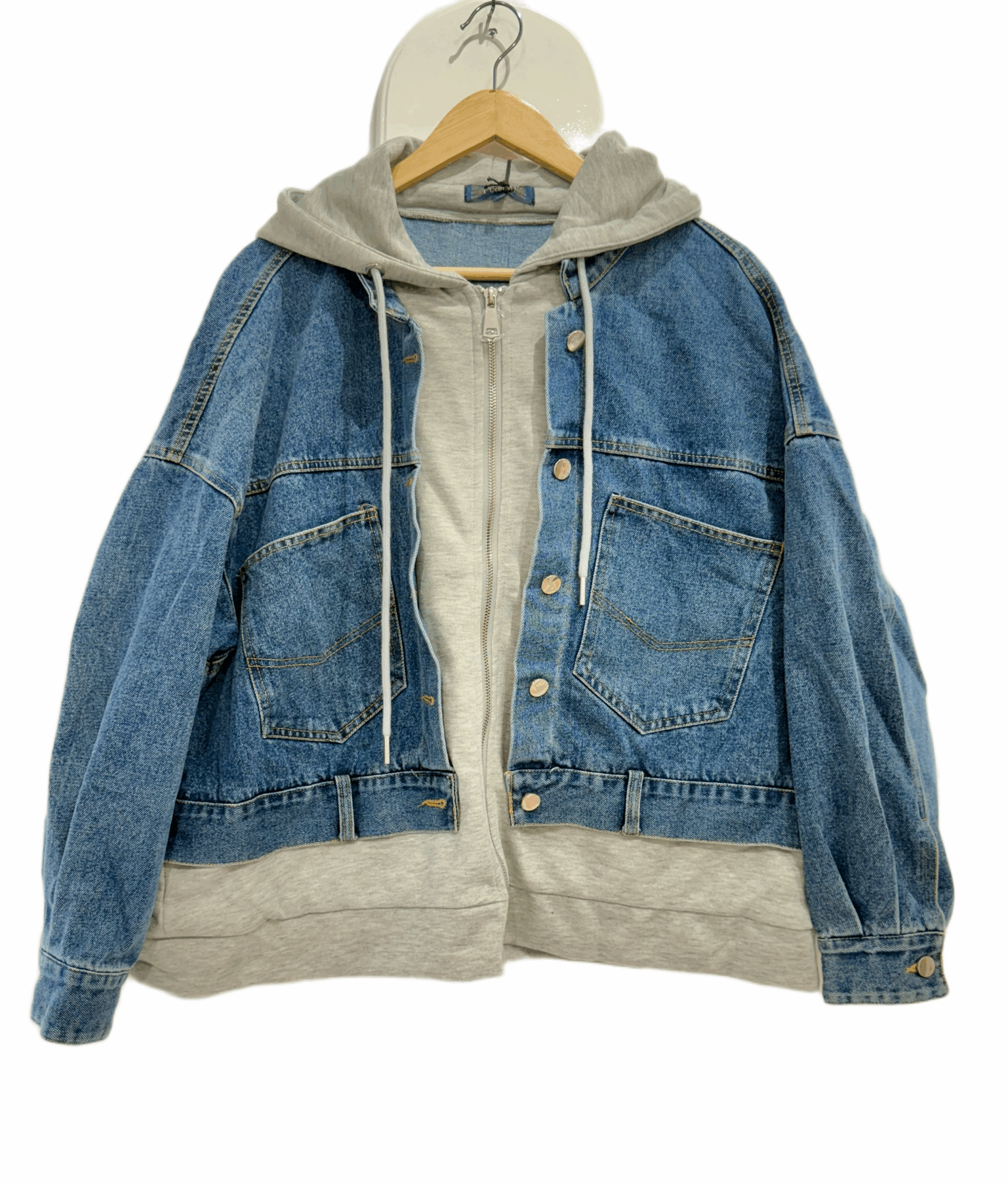 Τζιν μπουφάν σε oversized γραμμή με ενσωματωμένη κουκούλα και φούτερ λεπτομέρειες. Διαθέτει μπροστινές τσέπες, μεταλλικά κουμπιά και εσωτερικό φερμουάρ. Ο συνδυασμός denim και γκρι φούτερ προσφέρει μοντέρνο streetwear στυλ και άνεση, ιδανικό για καθημερινές εμφανίσεις.