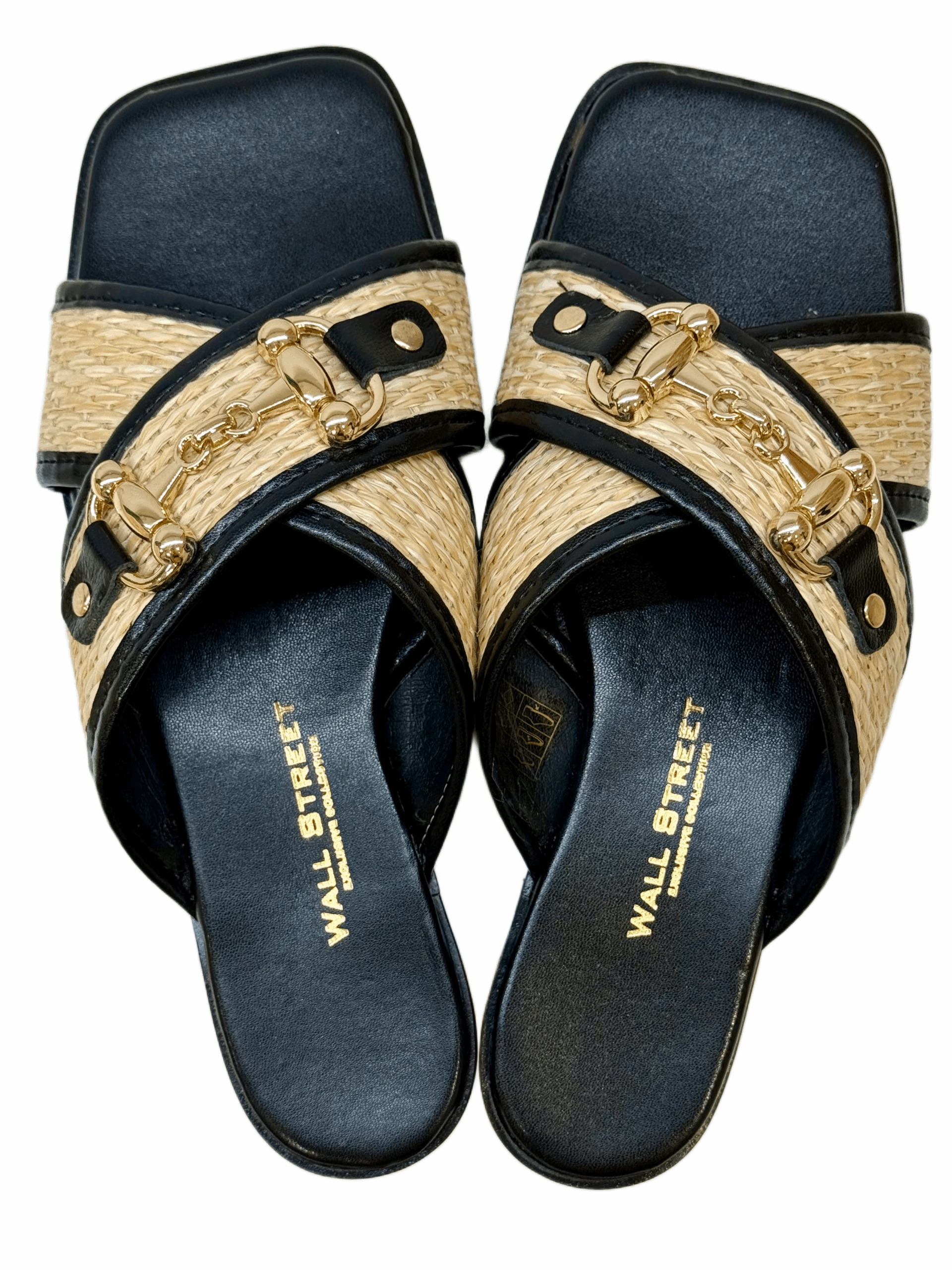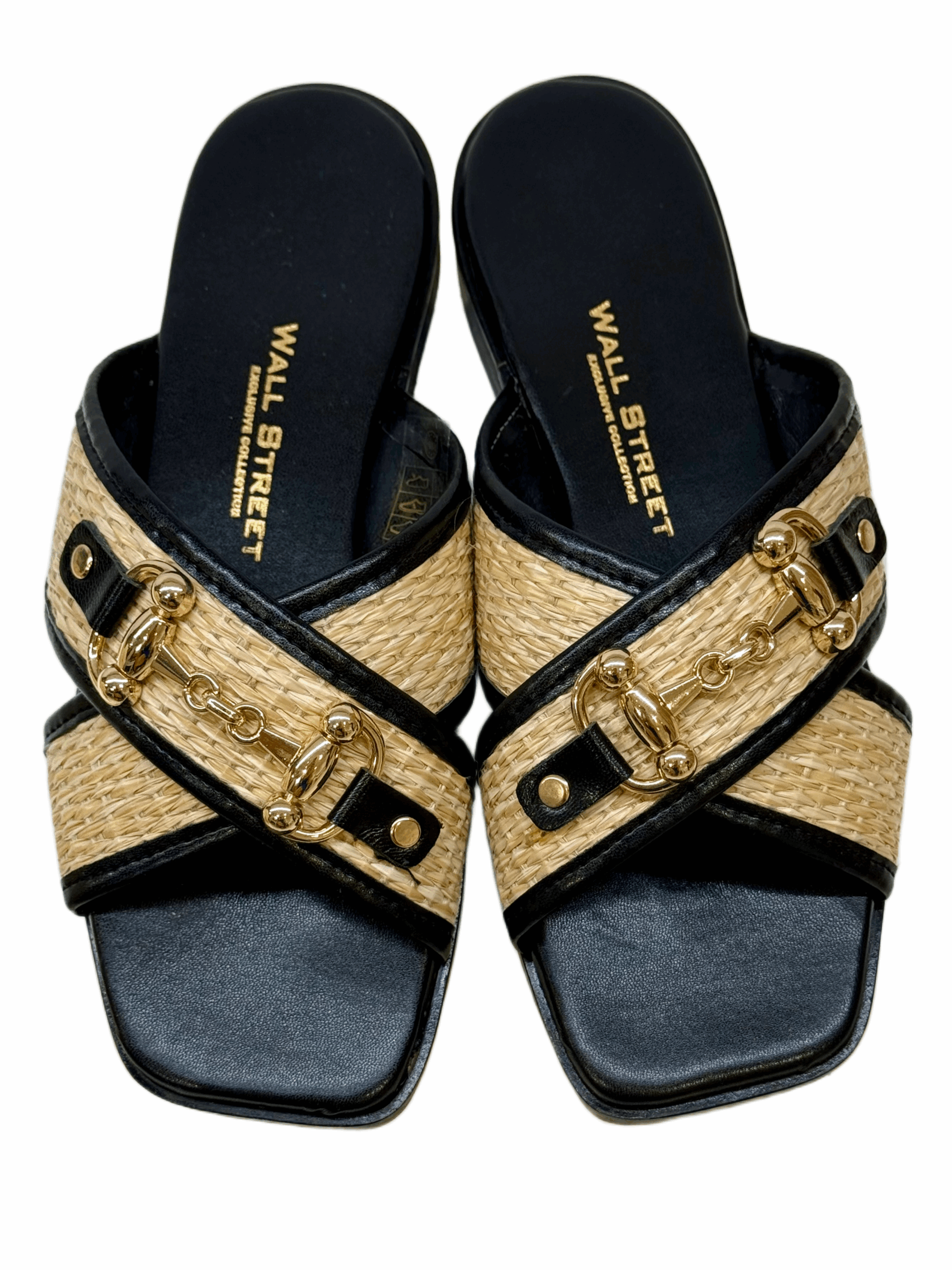 Κομψά slides με σταυρωτά λουράκια από υφαντή ψάθα σε φυσικό τόνο και λεπτομέρειες σε μαύρο δέρμα. Διακοσμημένα με χρυσά μεταλλικά στοιχεία που προσθέτουν μια αίσθηση πολυτέλειας και κάνουν το σχέδιο να ξεχωρίζει. Άνετα και στιλάτα, ιδανικά για καλοκαιρινές εμφανίσεις στην πόλη ή το νησί.