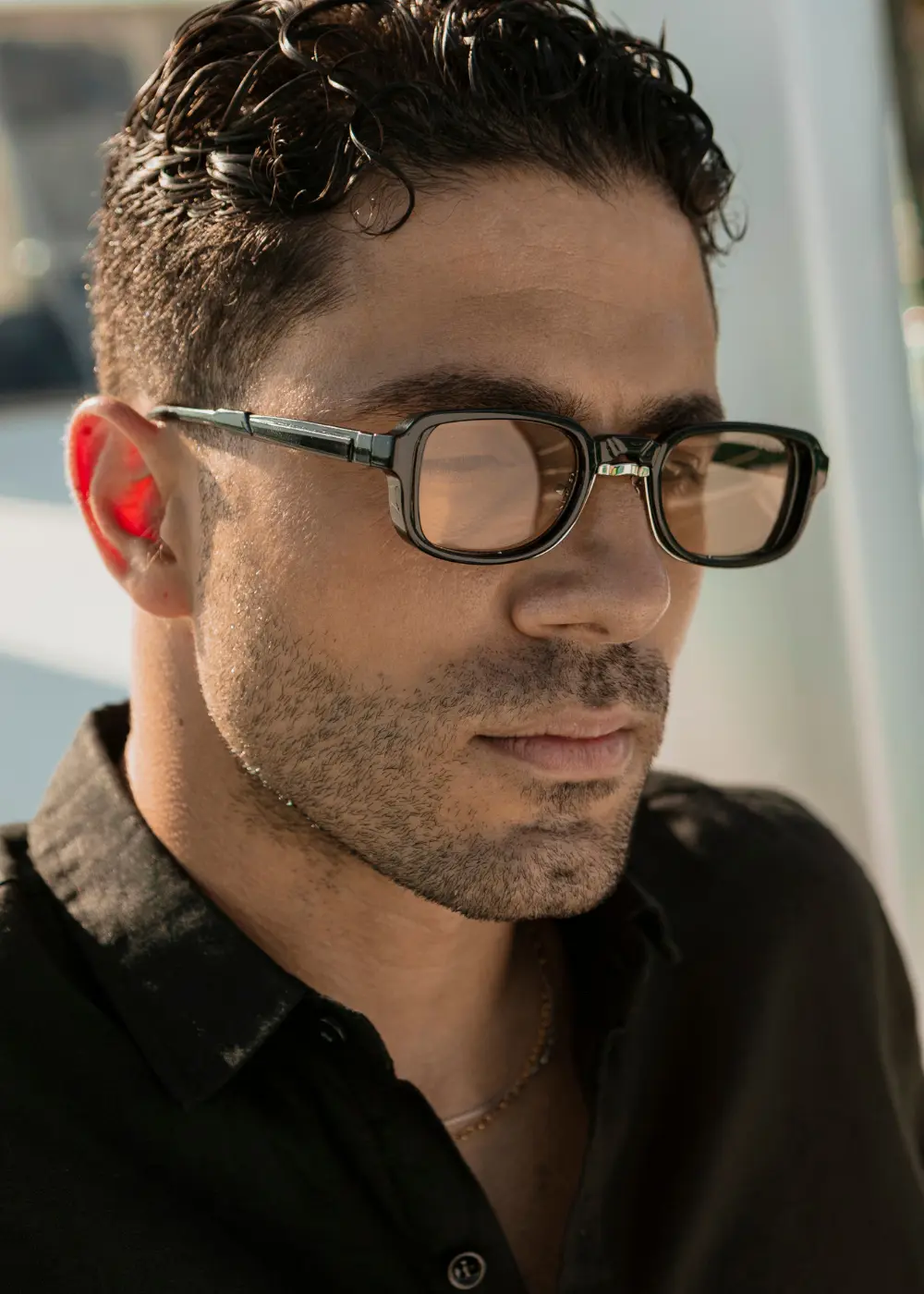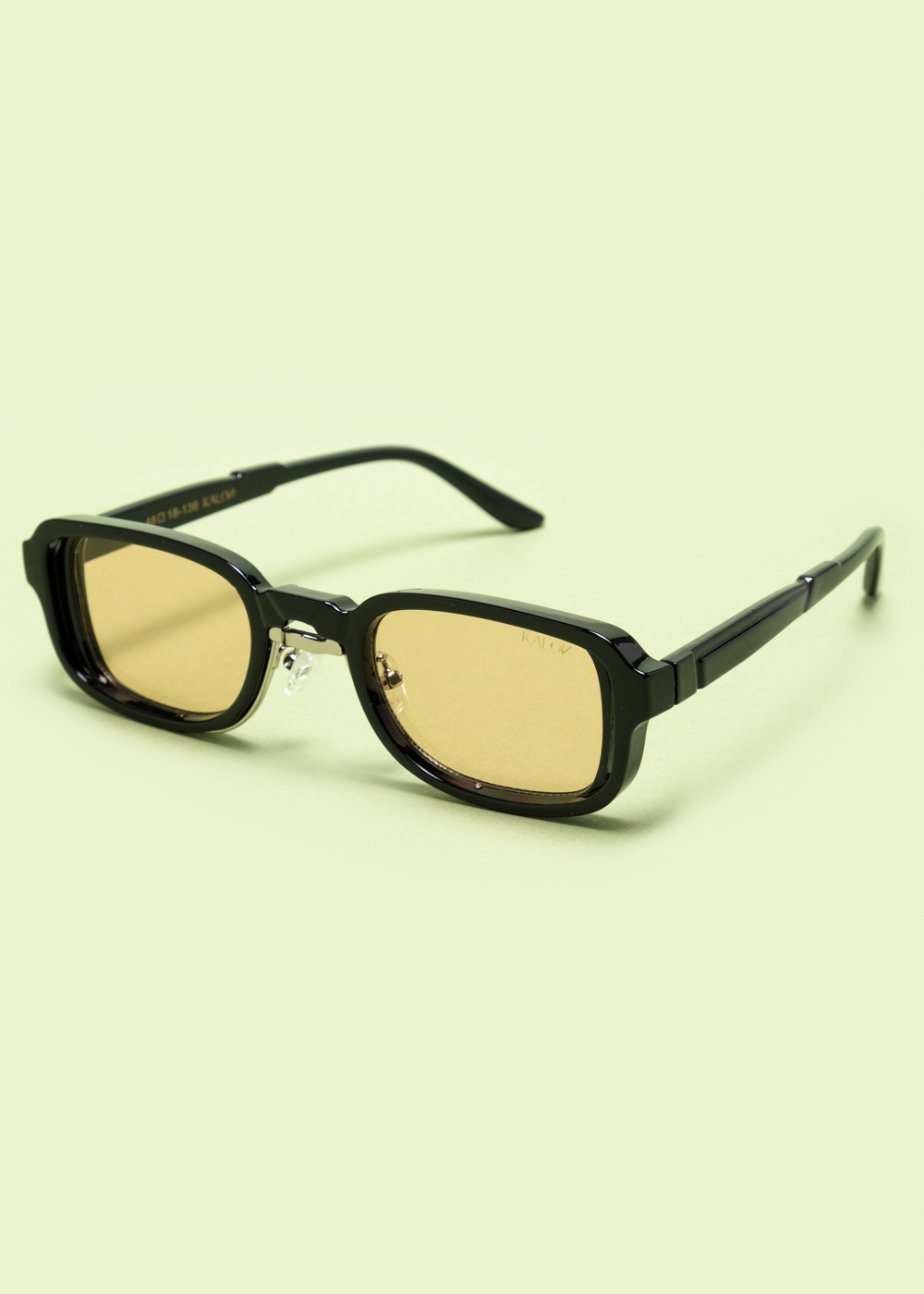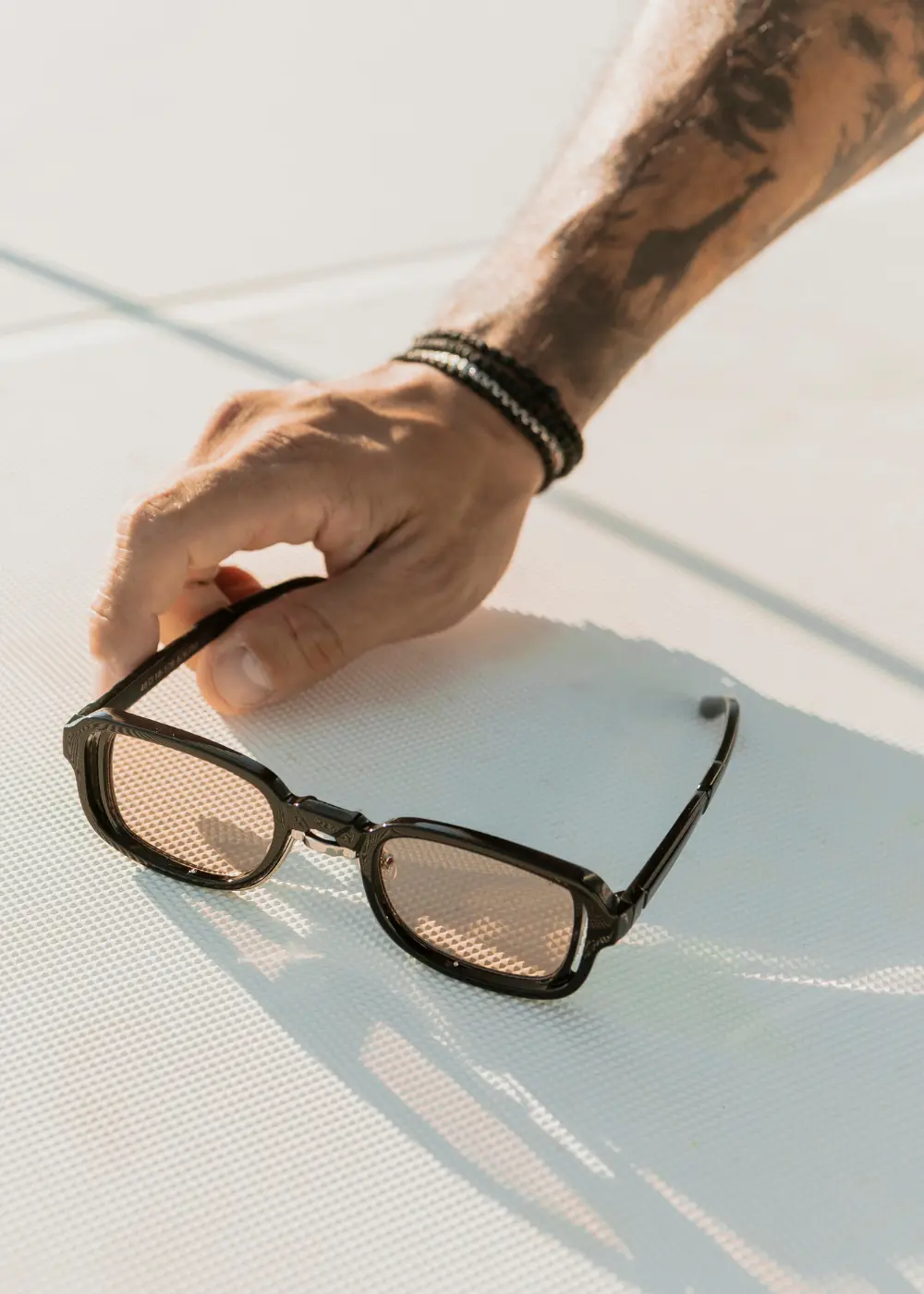 Μαύρα γυαλιά ηλίου με ορθογώνιο σκελετό και φακούς σε απόχρωση light tea. Διαθέτουν μεταλλική λεπτομέρεια στη γέφυρα και σταθερή κατασκευή. Ιδανικά για καθημερινή χρήση και προστασία από τον ήλιο.