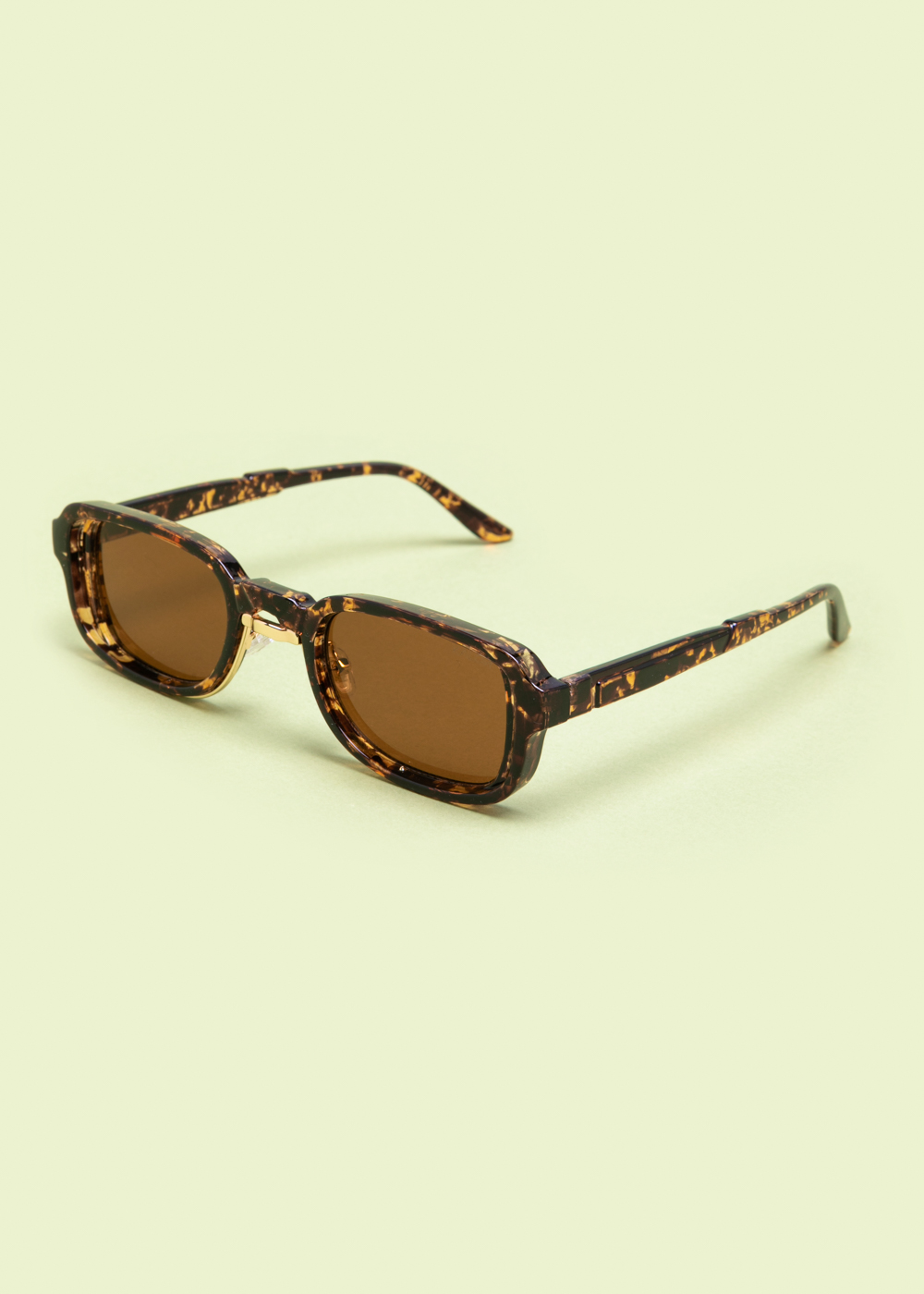 Γυαλιά ηλίου με ορθογώνιο σκελετό σε ταρταρούγα μοτίβο και καφέ φακούς. Διαθέτουν χρυσή λεπτομέρεια στη γέφυρα και σταθερή κατασκευή. Ιδανικά για καθημερινή χρήση και προστασία από τον ήλιο.