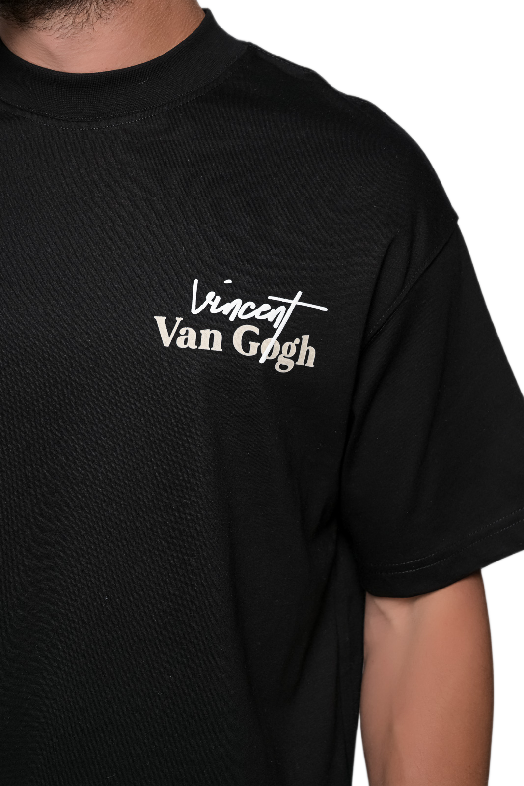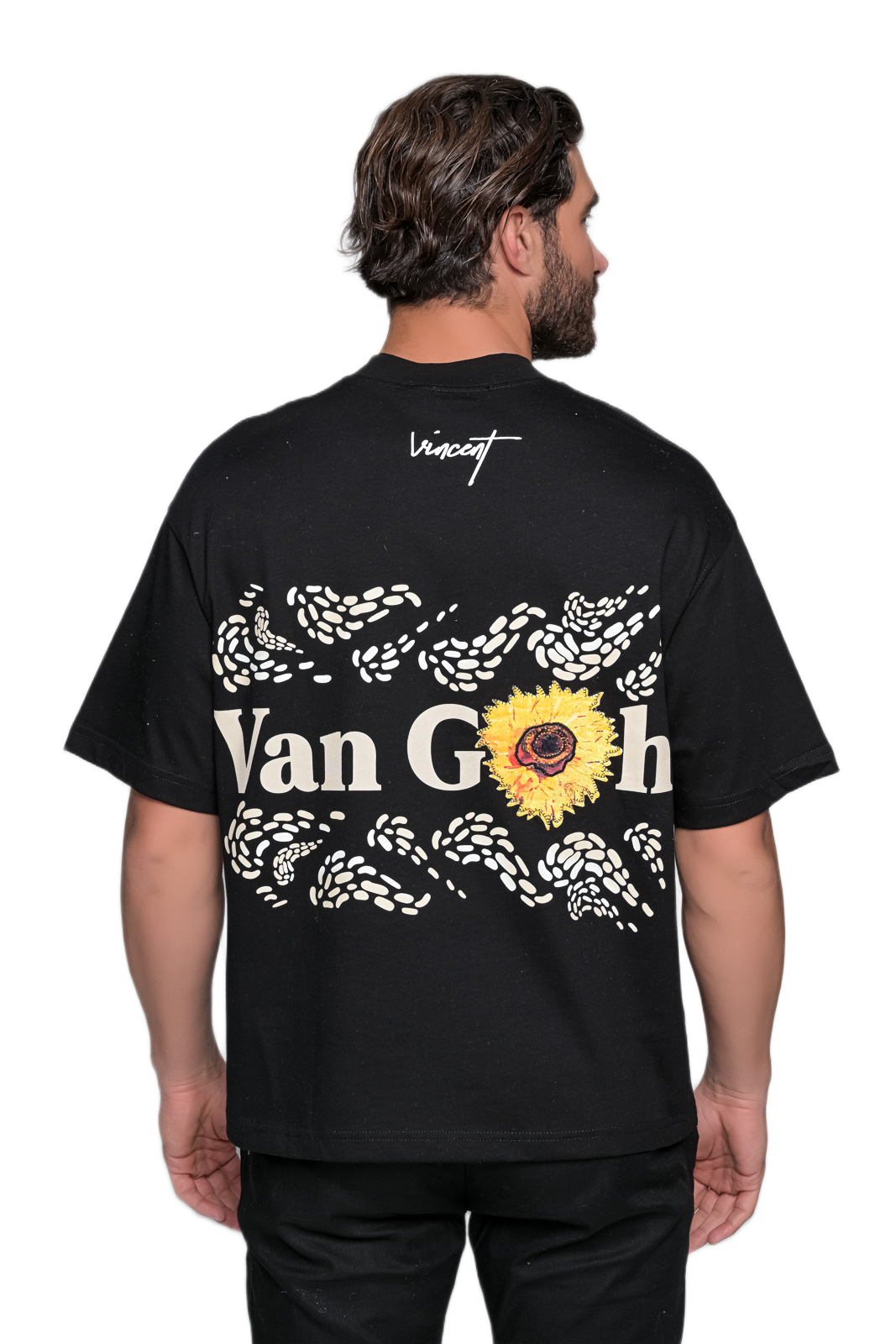 Μαύρο ανδρικό T-shirt με εμπνευσμένο σχέδιο από τον Vincent Van Gogh. Στο μπροστινό μέρος διαθέτει διακριτικό logo “Vincent Van Gogh”, ενώ στο πίσω μέρος ξεχωρίζει το εντυπωσιακό print με ηλιοτρόπιο και καλλιτεχνικά μοτίβα. Κατασκευασμένο από βαμβακερό ύφασμα υψηλής ποιότητας, προσφέρει άνεση και μοναδικό στυλ. Ιδανικό για casual εμφανίσεις με artistic χαρακτήρα.