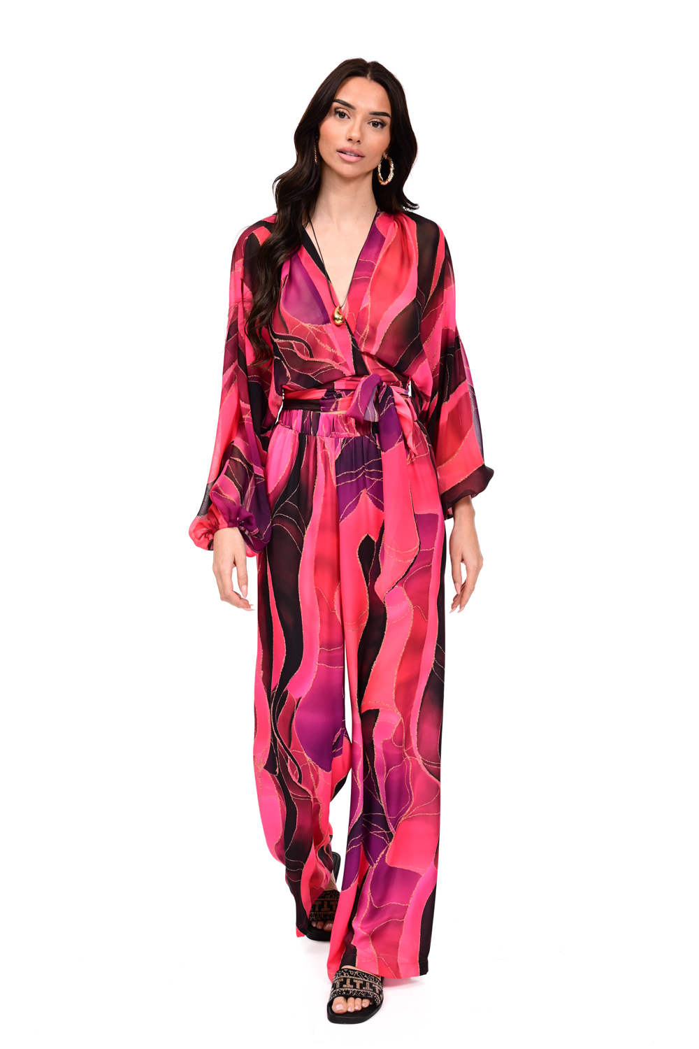 Εμπριμέ σετ σε αποχρώσεις του φούξια, του μαύρου και του μωβ, με ανάλαφρο ύφασμα και σατινέ υφή. Το πουκάμισο διαθέτει φαρδιά μανίκια και βαθύ ντεκολτέ, ενώ το παντελόνι είναι ψηλόμεσο με αέρινη, ίσια γραμμή.